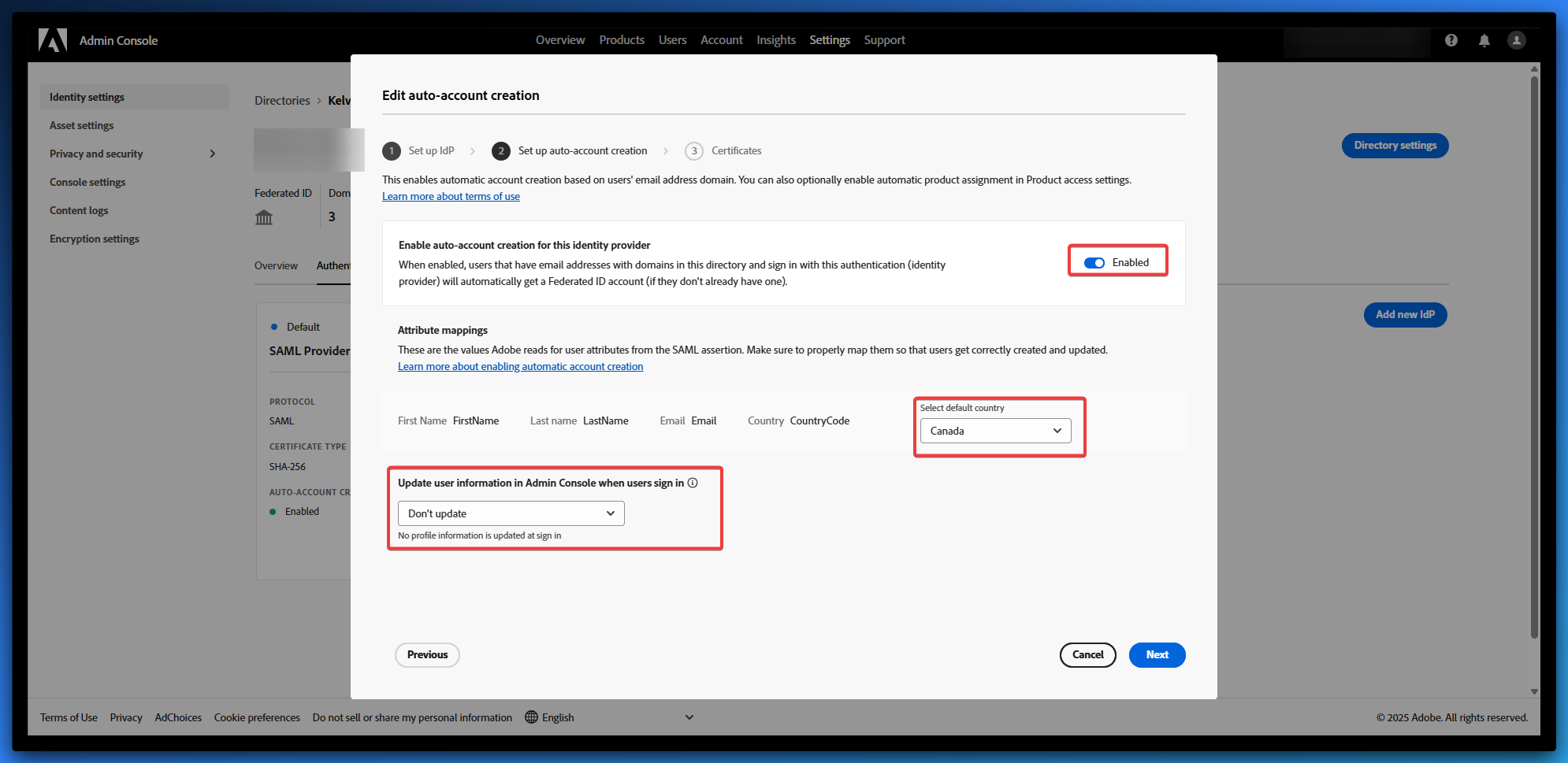 - Select Enabled beside Enable auto-account creation for this identity provider.