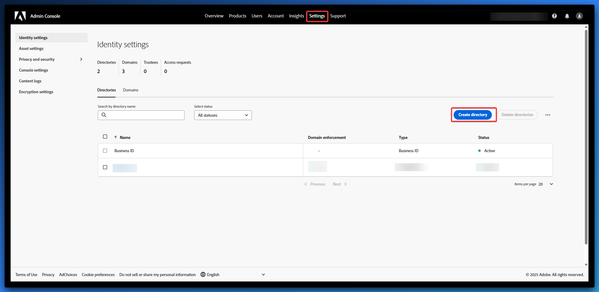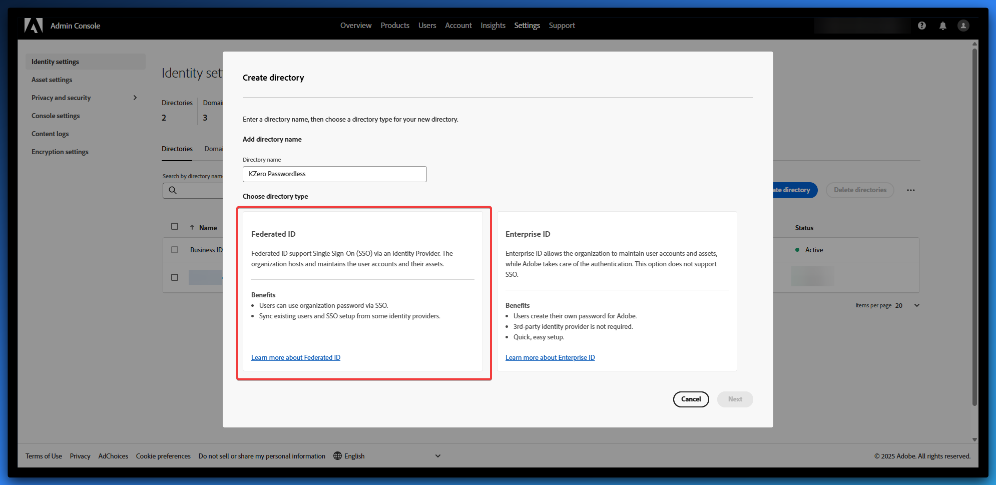 - Select Create directory on the Identity Settings screen.