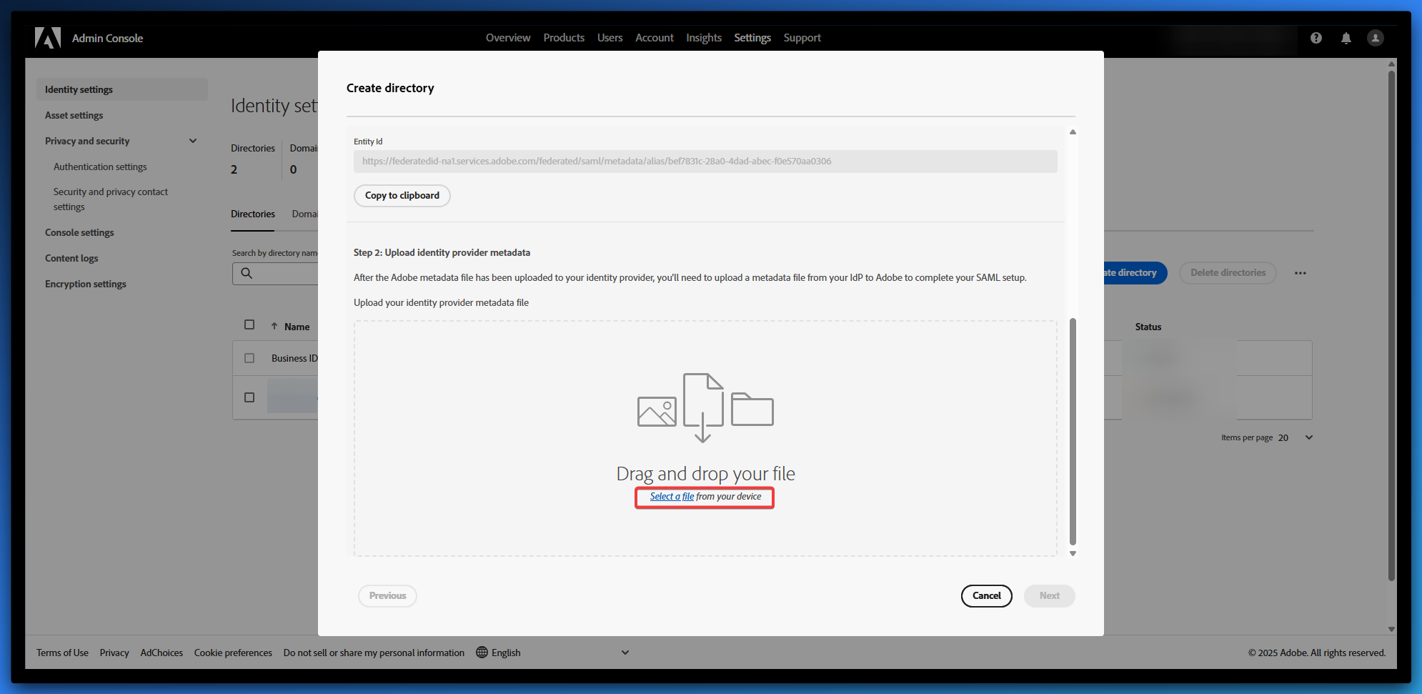 - Select Upload File and upload the Adobe Service Provider Metadata you obtained in Step 2.