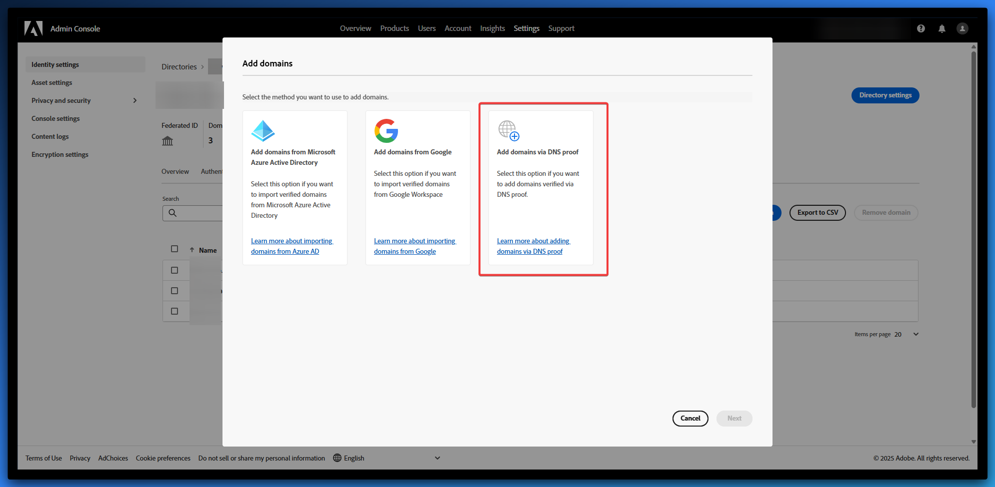 - Select Add domains via DNS proof.