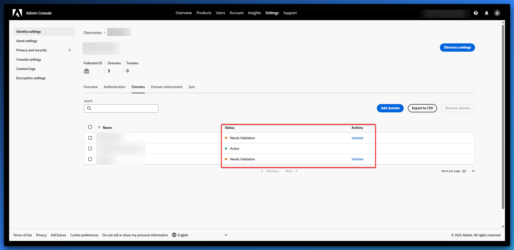 - In the Domains tab in Adobe, click Validate beside the domain. It should change to an Active status.