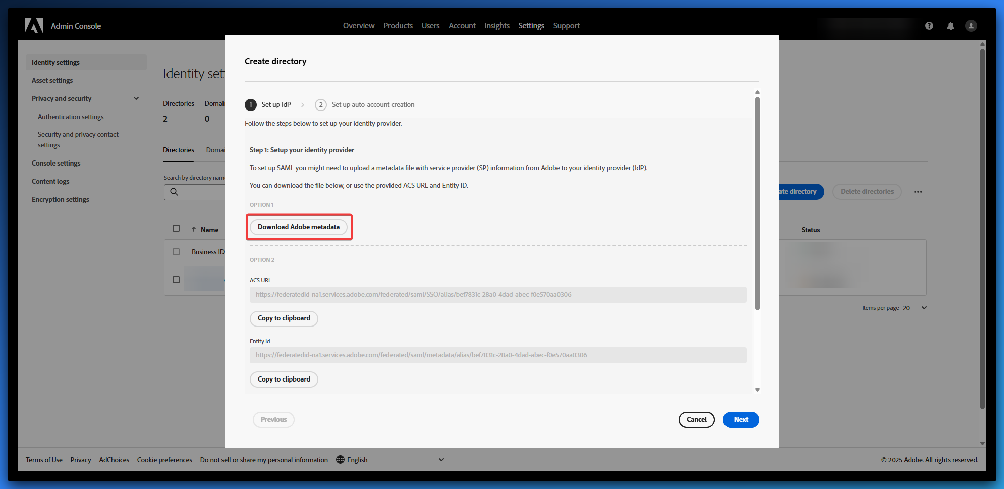 - Click Download Adobe metadata and save the file locally.