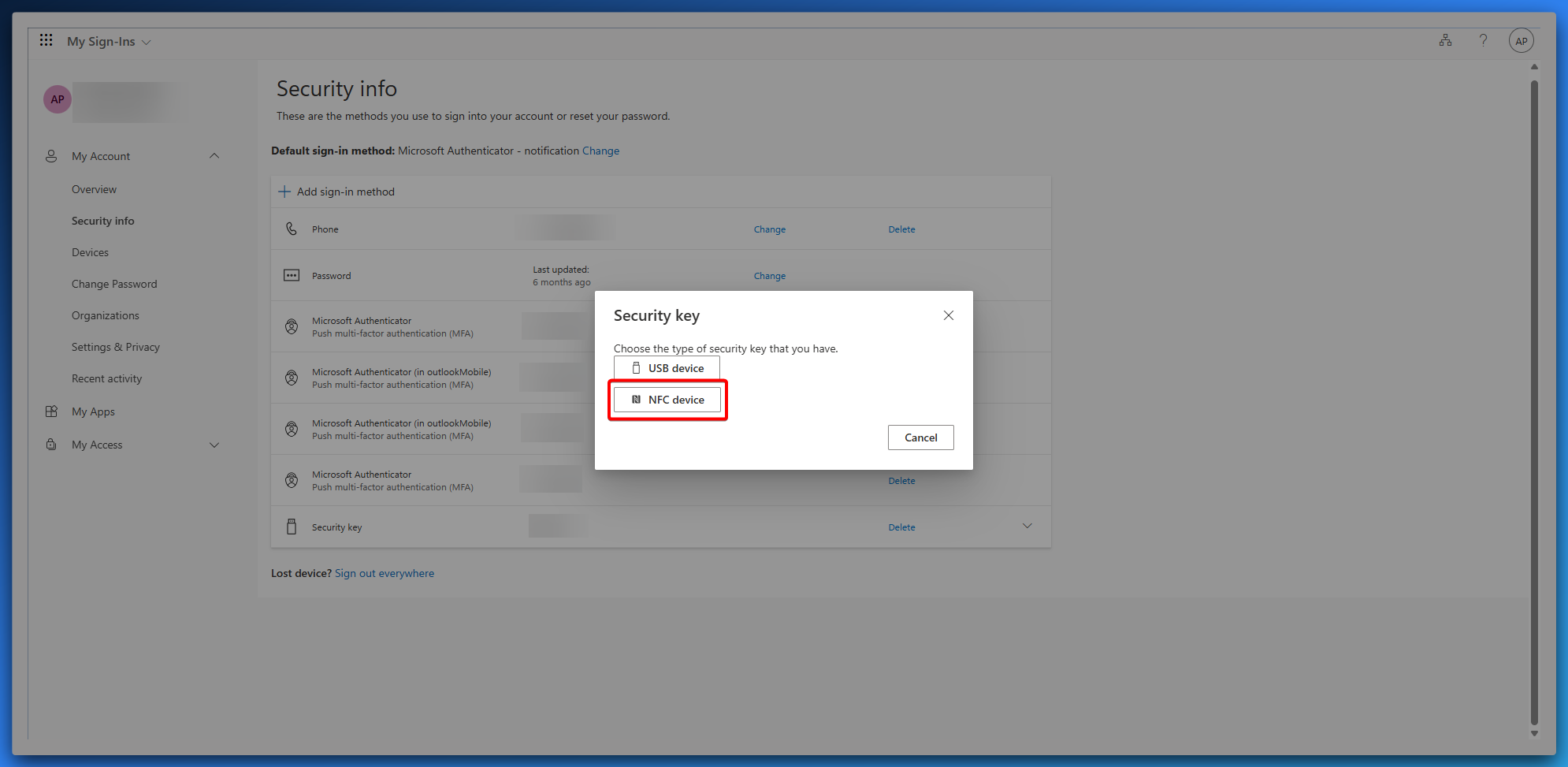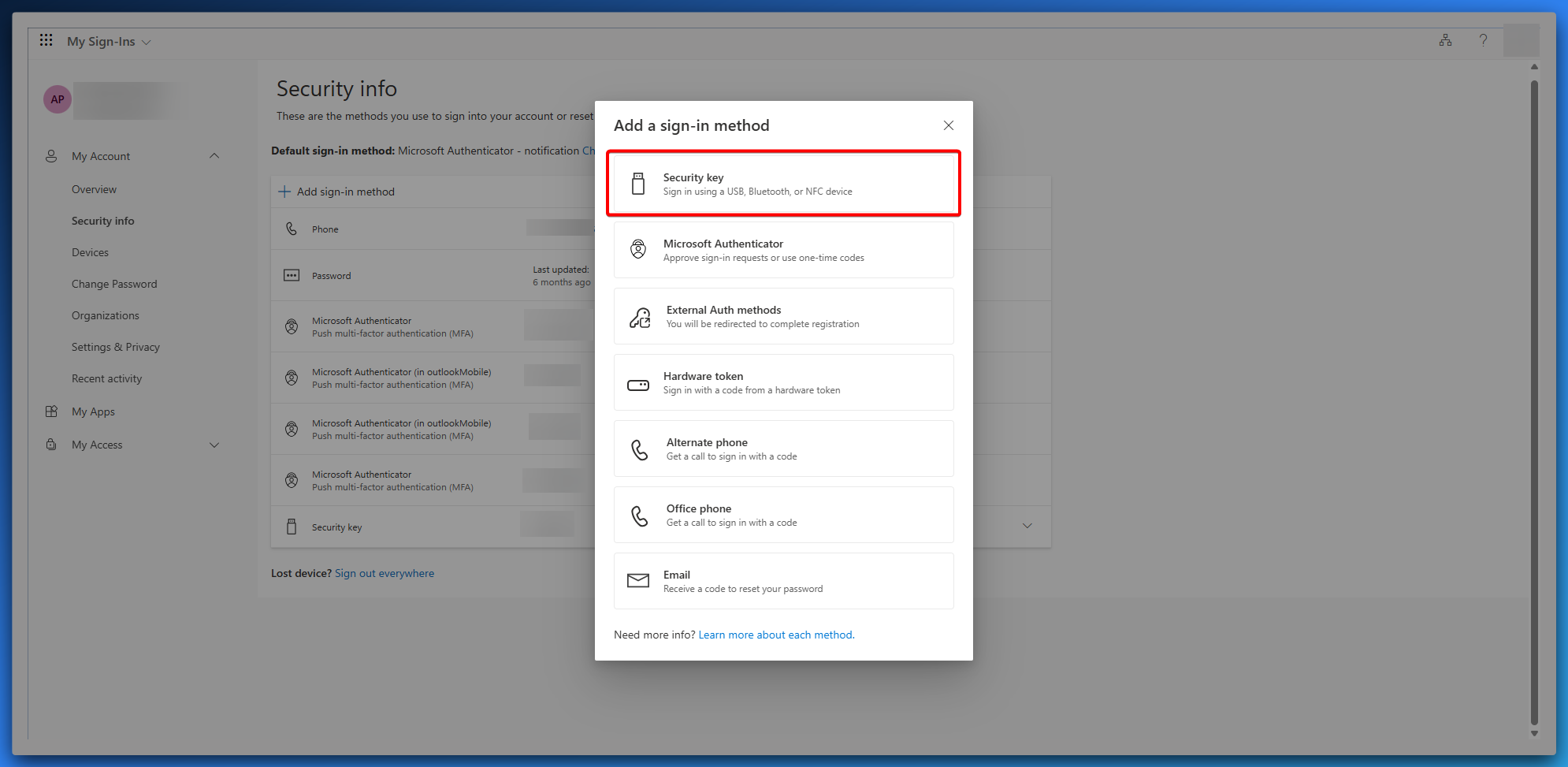 If you don’t see the option for “Security key” on the Microsoft security info page, your organization or account type might not yet support this method. See Microsoft’s official guidance.