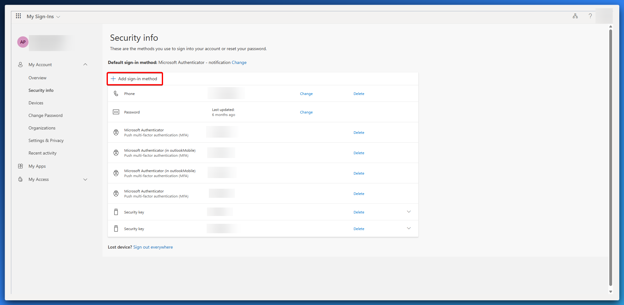 - Navigate to your Microsoft account’s security info page: https://mysignins.microsoft.com/security-info