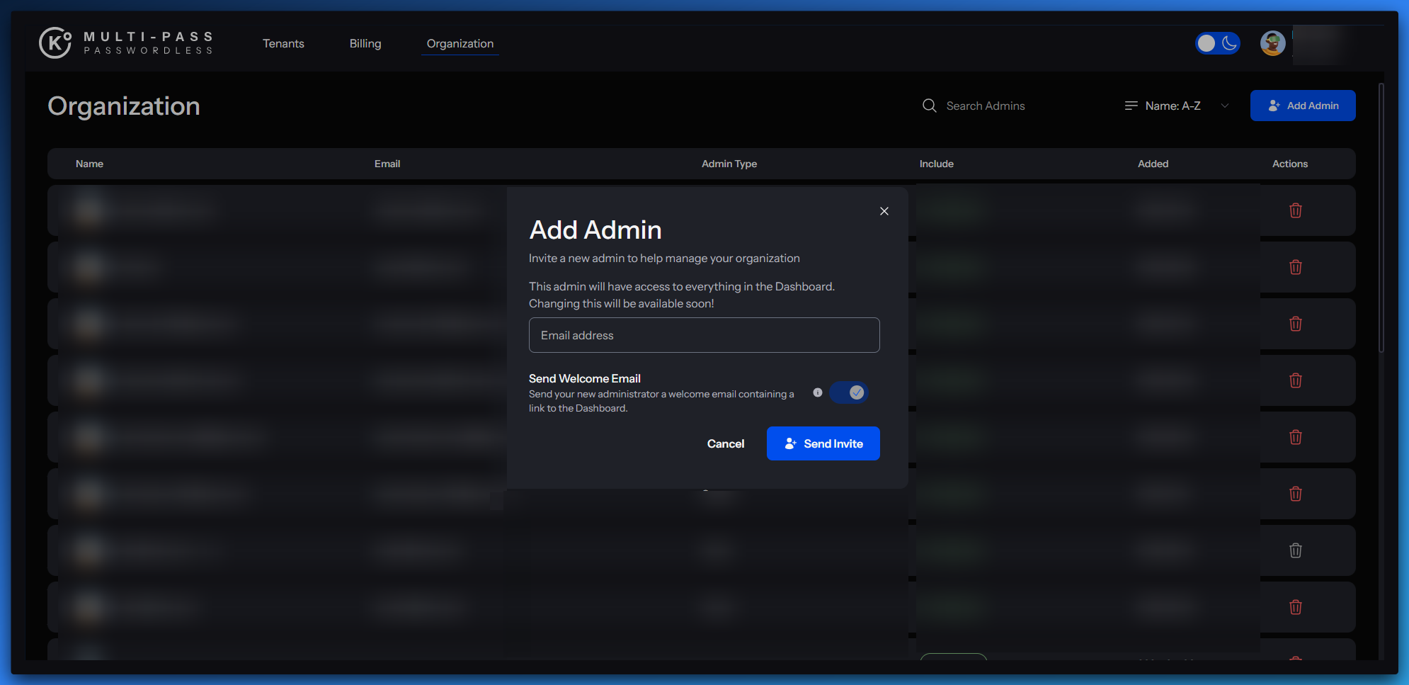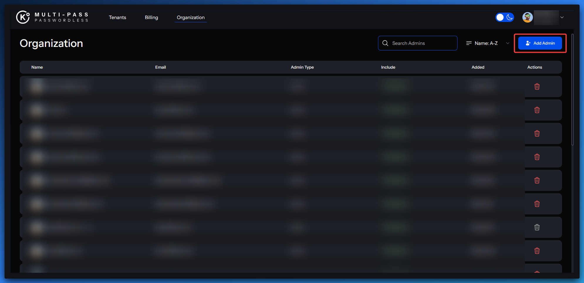 This documentation provides a step-by-step guide for adding new Administrators to the KZero Passwordless Dashboard. The new Administrator will have the ability to create new tenants and edit current tenants.