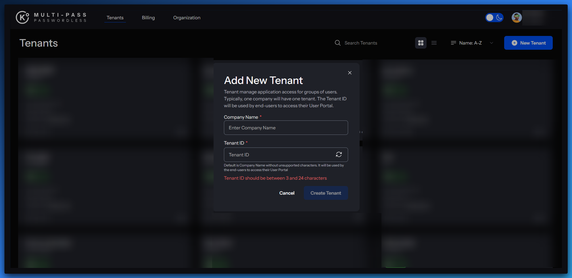 - Fill in the Company Name and Tenant ID and click Create Tenant