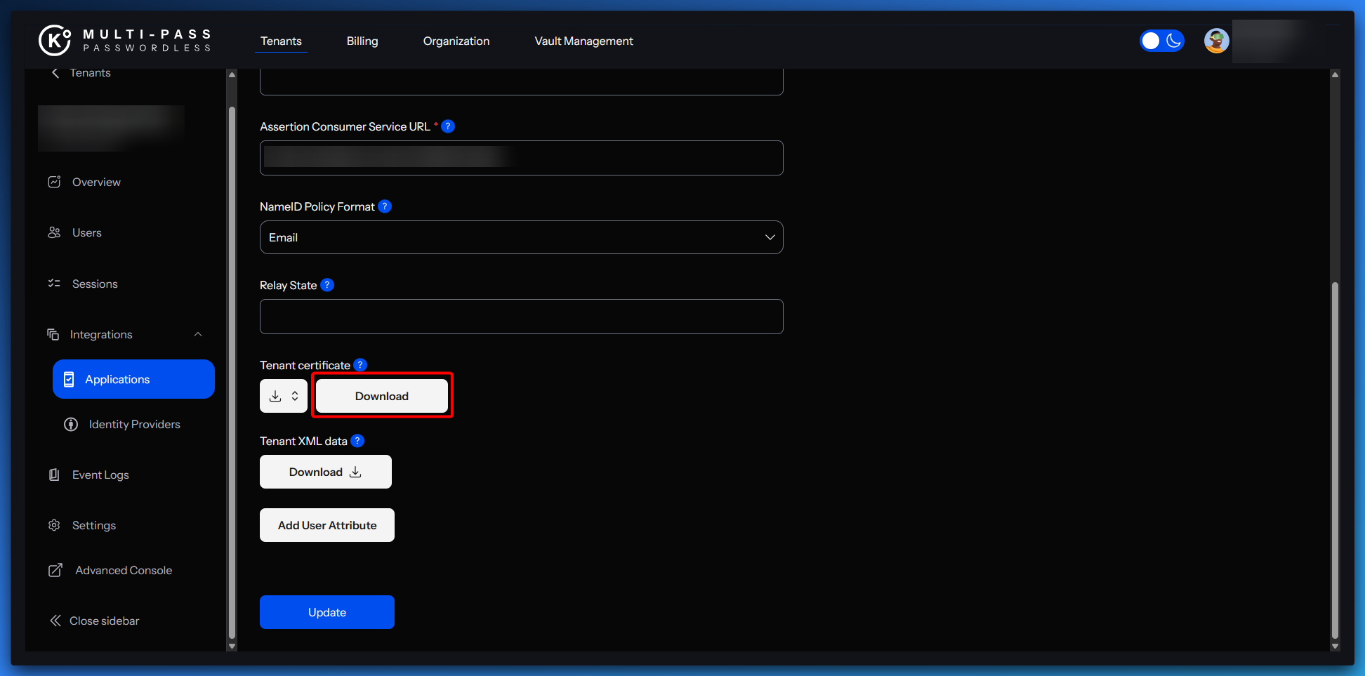 | Entity ID | https://ca.auth.kzero.com/realms/<TENANT_NAME> |