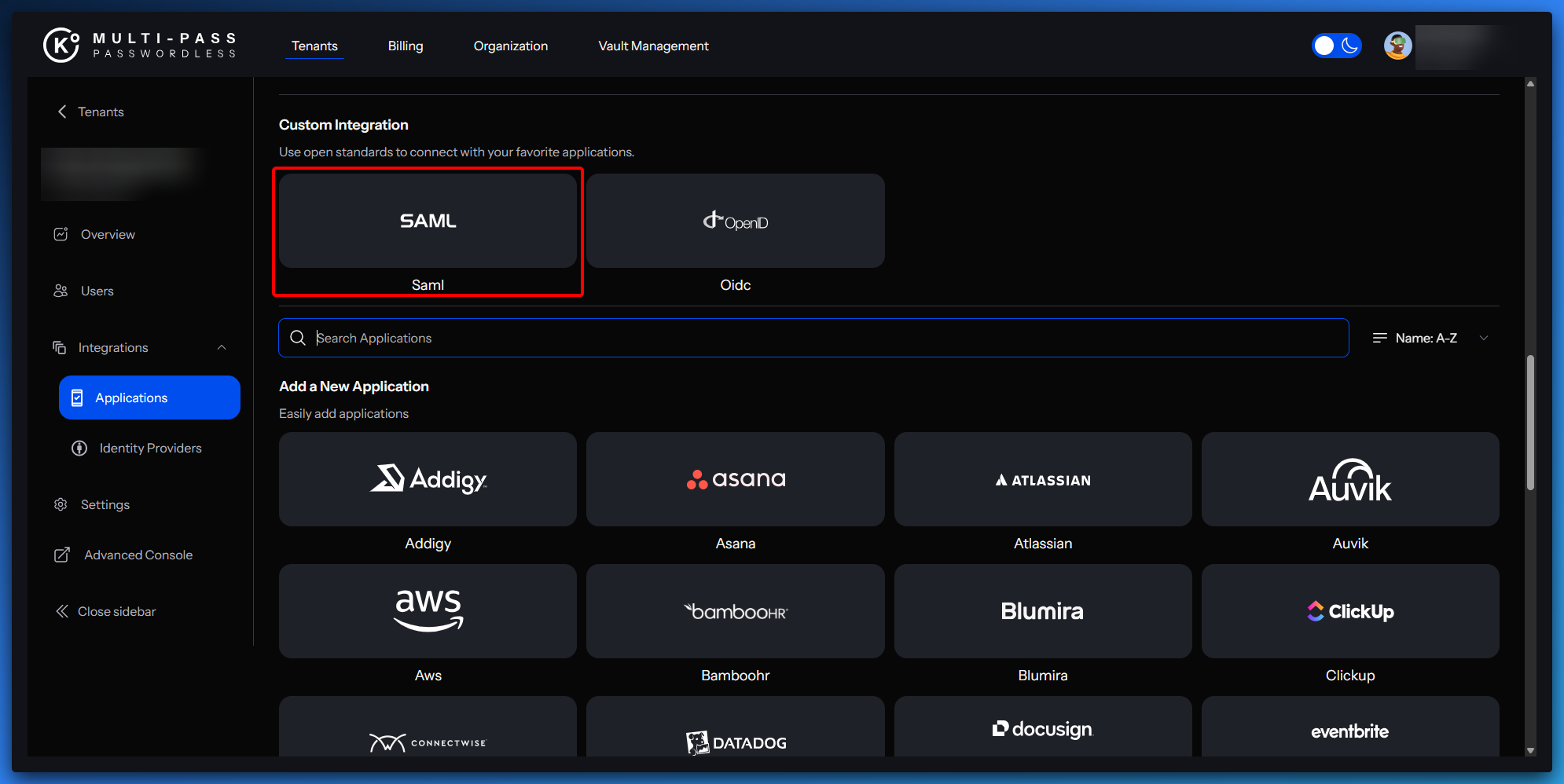 - In the Custom section, choose SAML.
