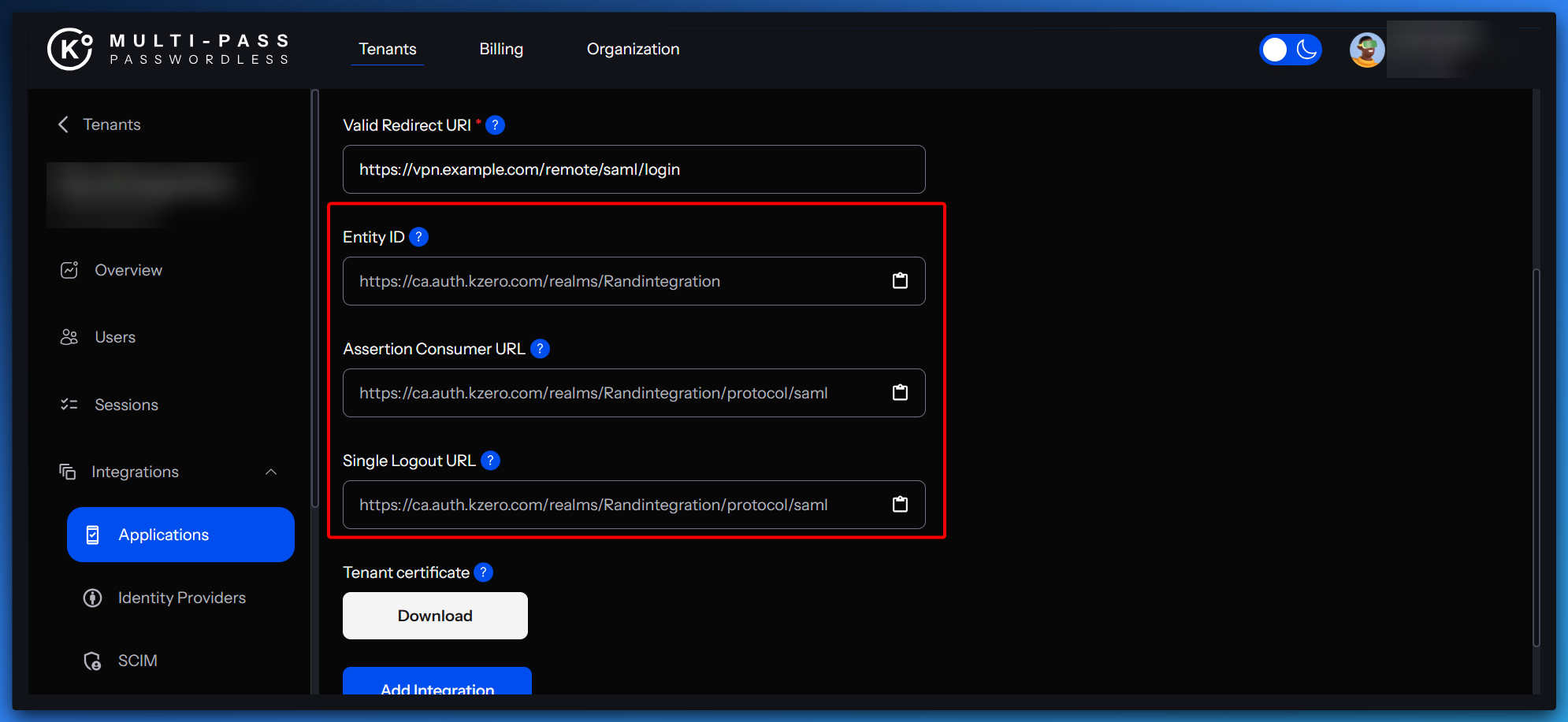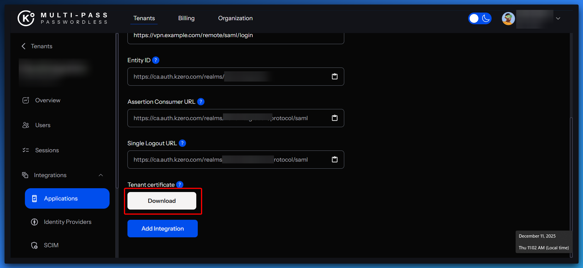 - You will need to provide the x.509 to FortiGate, on "tenant certificate" click on the button on the left of "Download"