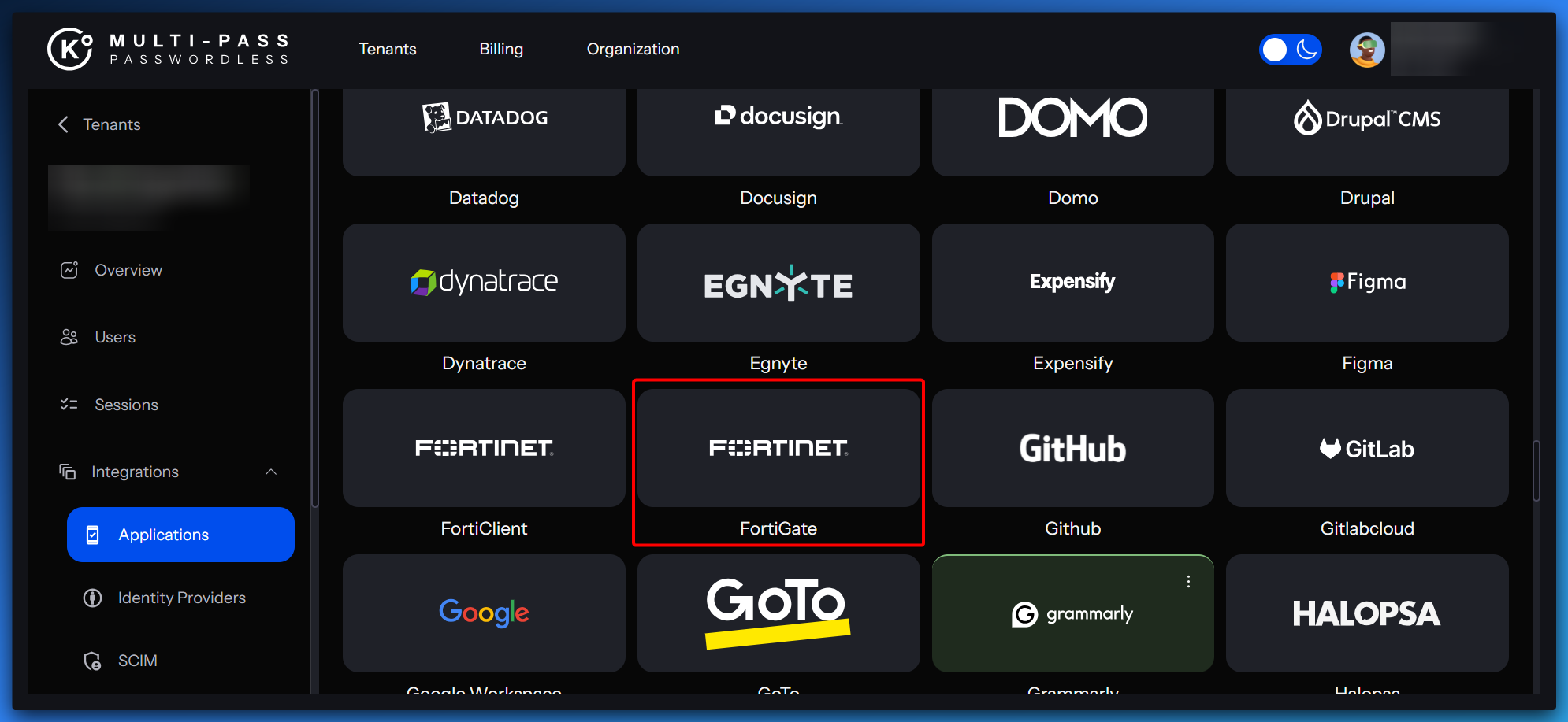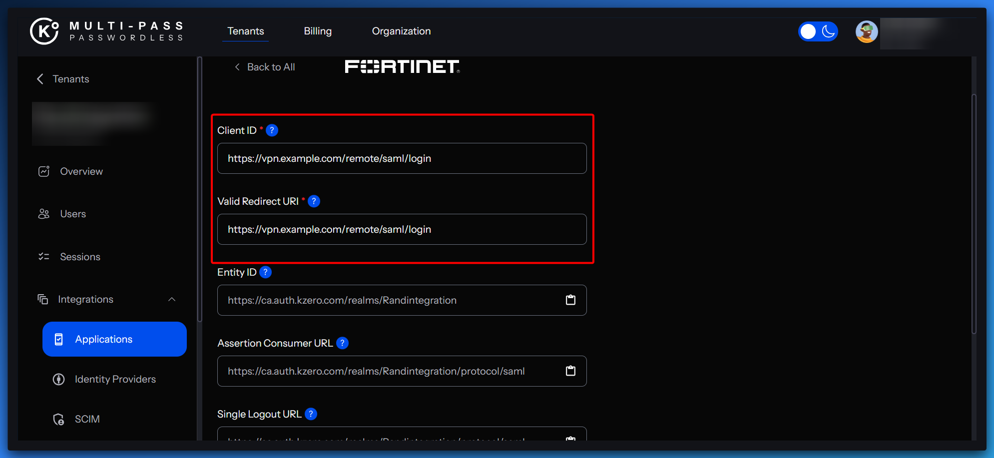 In order to make this configuration easier, we advice you to open two windows, one on your Multi-Pass Dashboard and the other on FortiClient / FortiGate admin console. it will allow you to copy and paste the different fields.