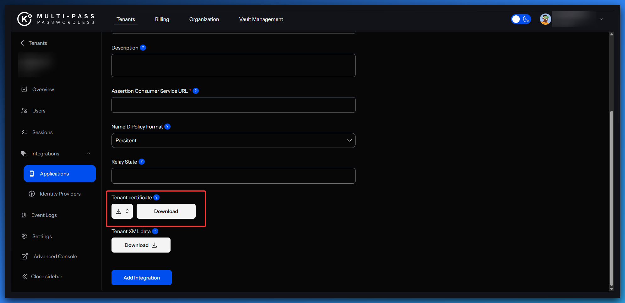 - Select the correct tenant and go to Integrations, then click on Applications.