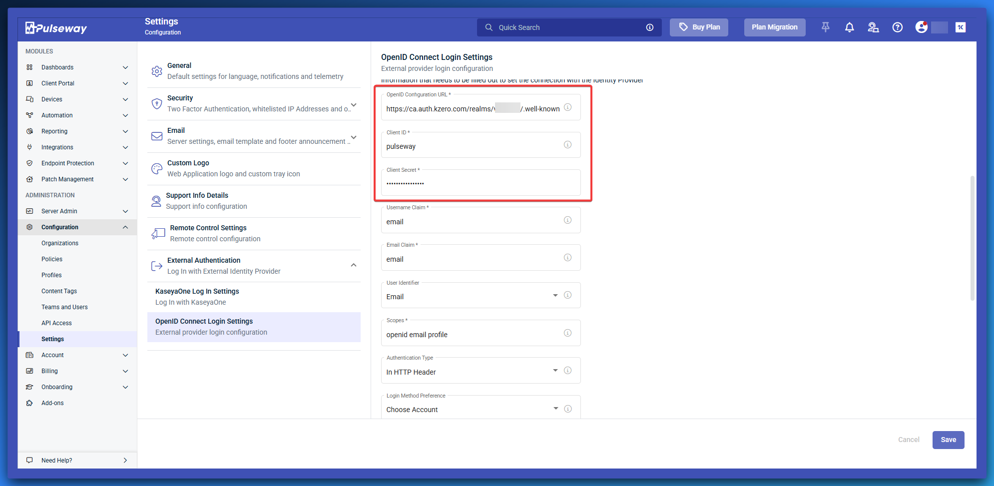 - Browse to Configuration > Settings > External Authentication > OpenID Connect Login Settings.
