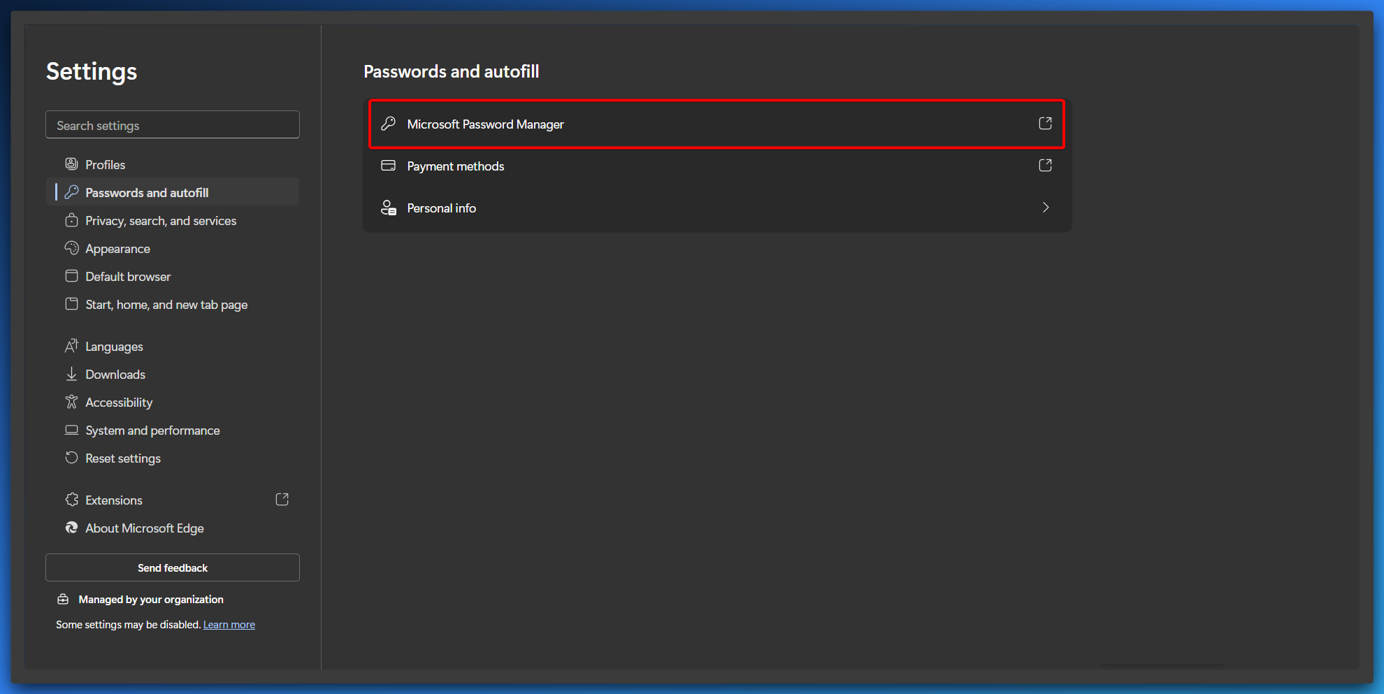 - In the address bar, type: edge://settings/passwords Or click the three dots (⋮)