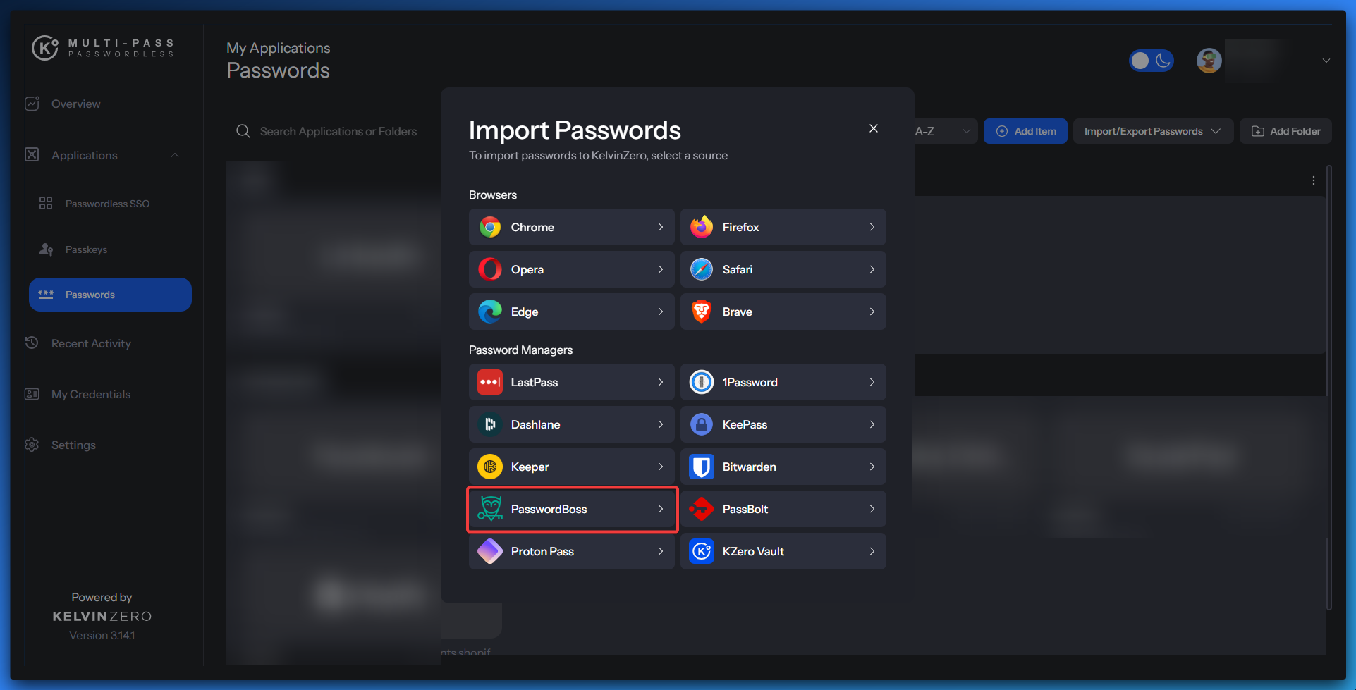 This integration has been fully tested and validated by Kelvin Zero Inc. If you experience any issues during import, please submit a support ticket.This document provides step-by-step instructions on how to import your saved passwords from PasswordBoss into your KZero Vault.