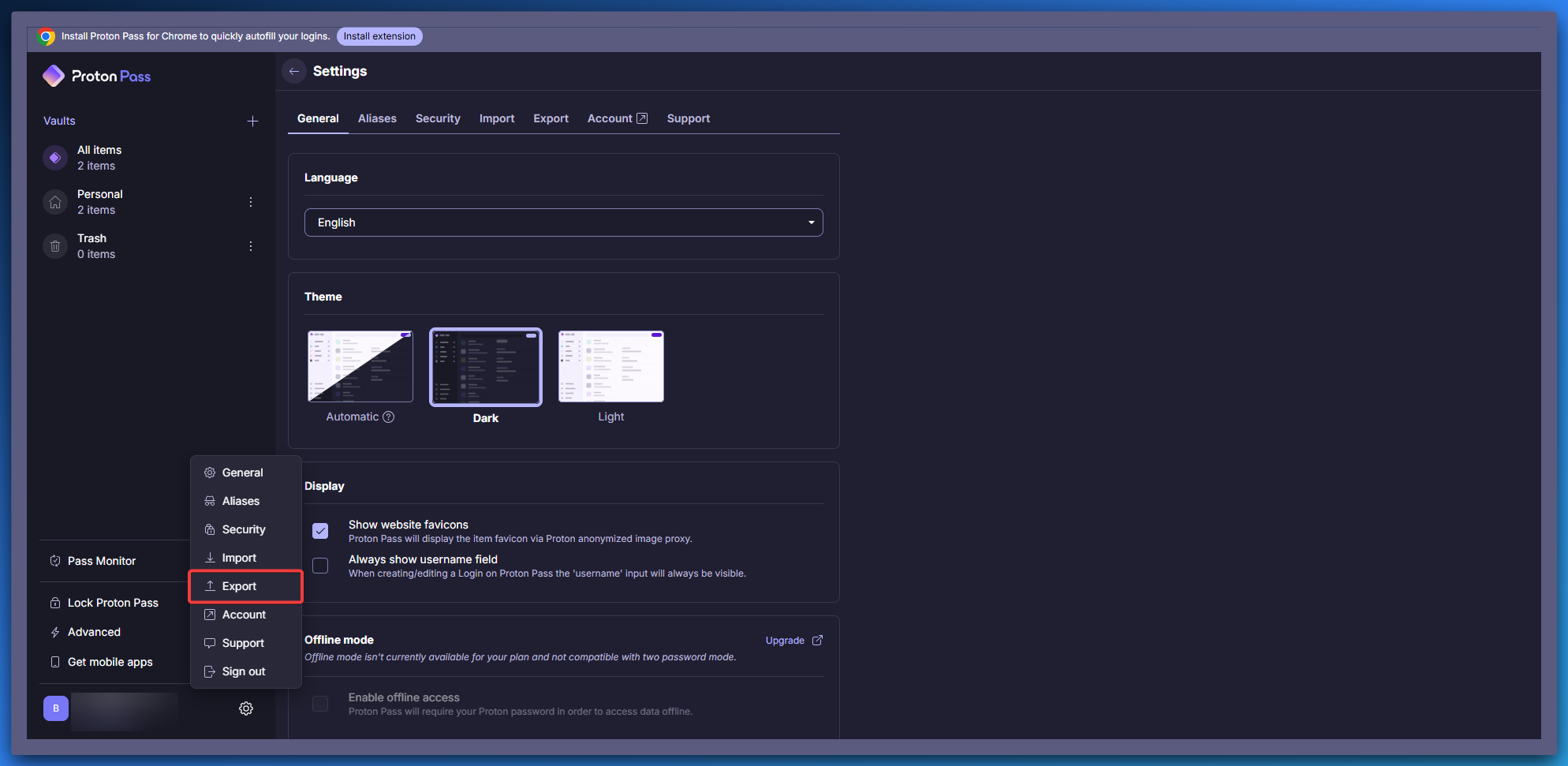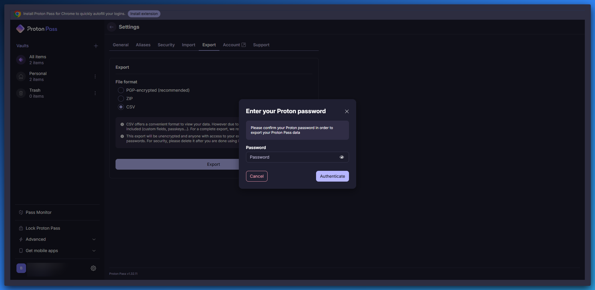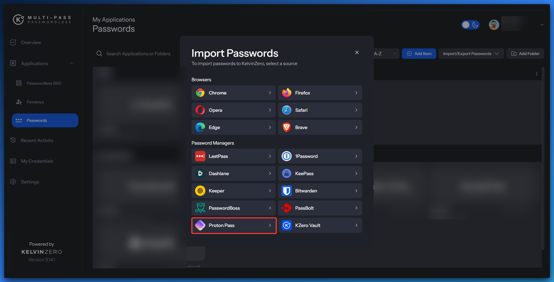 This integration has been fully tested and validated by Kelvin Zero Inc. If you experience any issues during import, please submit a support ticket.This document provides step-by-step instructions on how to import your saved passwords from Proton Pass into your KZero Vault.