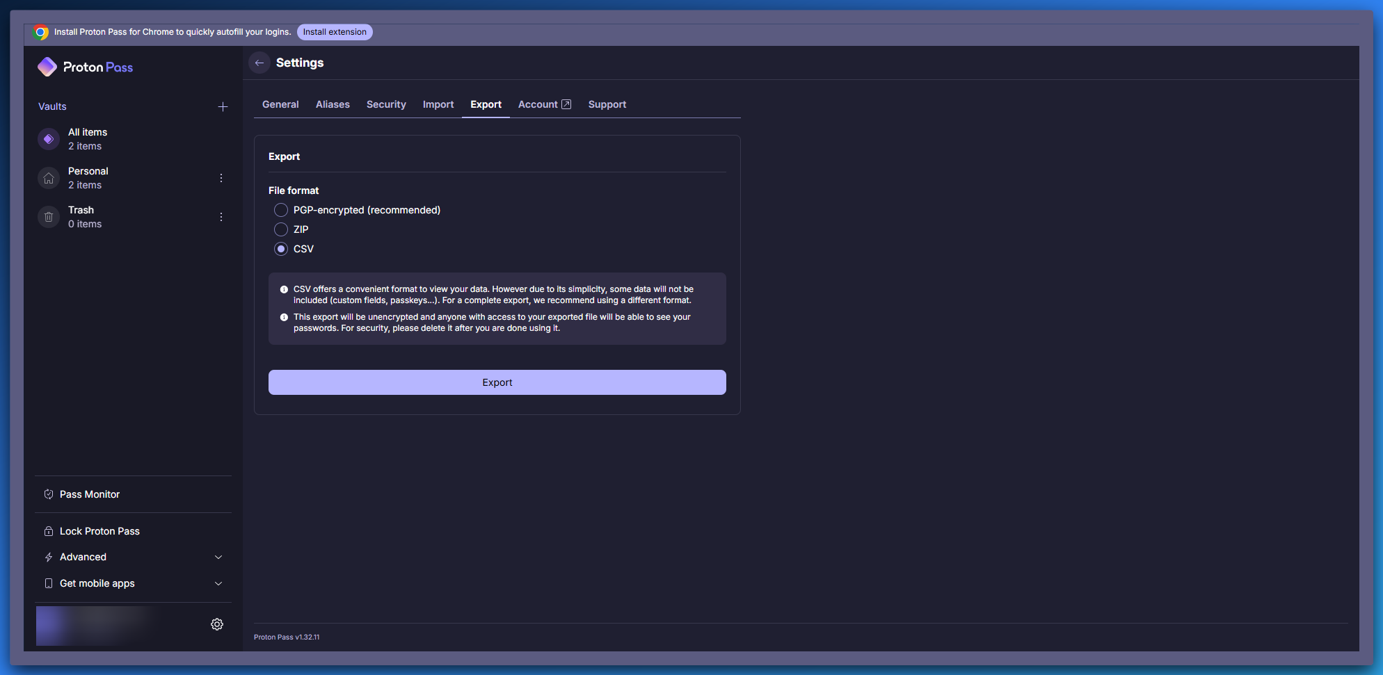 Password Managers typically export passwords into unencrypted CSV files. It is important that you securely delete the CSV file after the completion of the import.